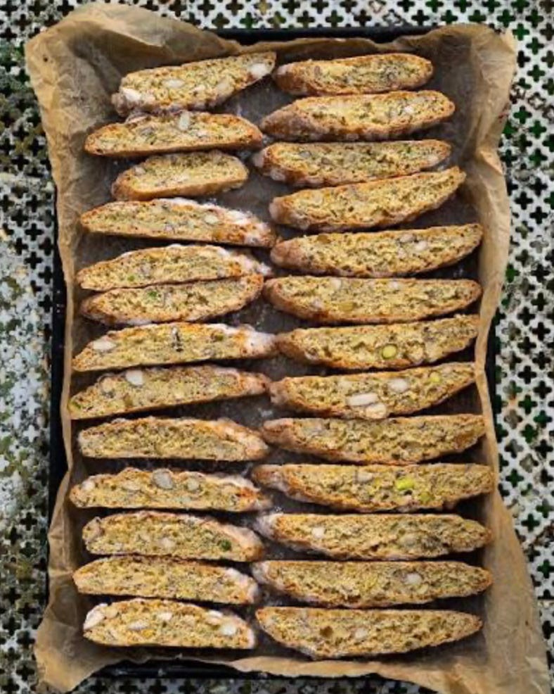 “Every year I love making a batch of cantucci biscuits before Christmas. They’re great dunked in a coffee or tea, alongside some poached fruit with cream or best of all dipped in Vin santo. Once baked they last for ages and make a great present too. You can use any nut or fruit in the dough and they’re incredibly simple to make. These are pistachio, with fennel seeds and lemon zest, dipped in dark chocolate and finished with orange zest. Absolutely delicious.”