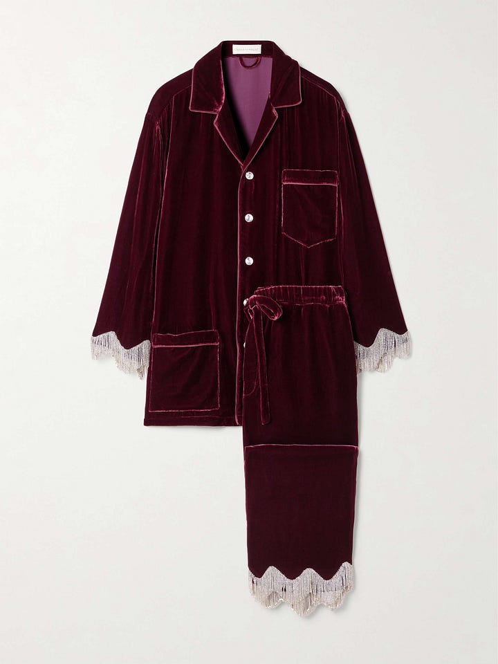 OLIVIA VON HALLE Fifi fringed crystal-embellished velvet pajama set