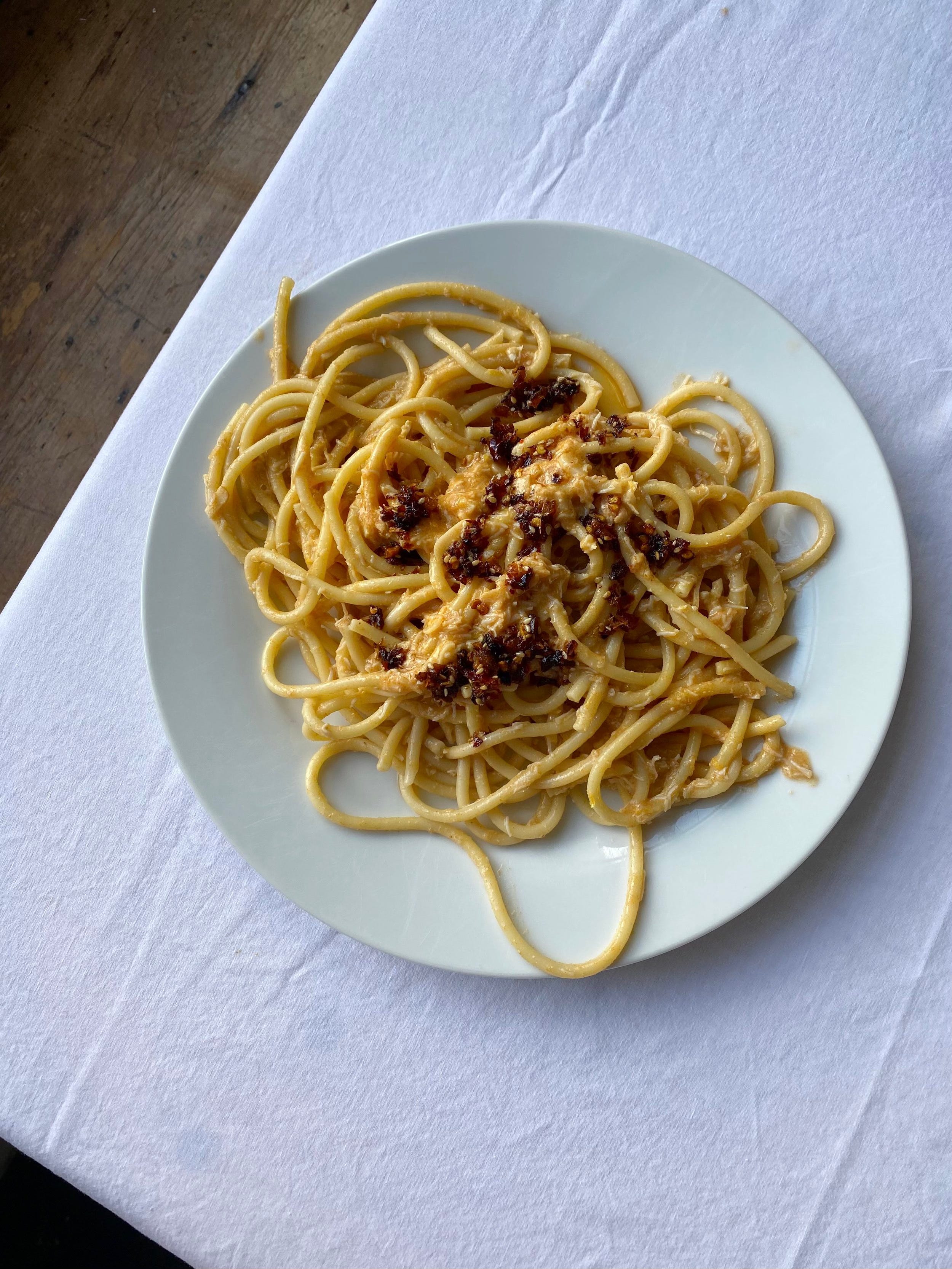 Adjust and Serve: Taste the pasta to check the seasoning, adding a little more pasta water if needed to loosen the sauce. Plate up the Crab Bucatini, add a bit more lemon zest on top, and finish with a spoonful of Chilli Sambal for an extra kick.