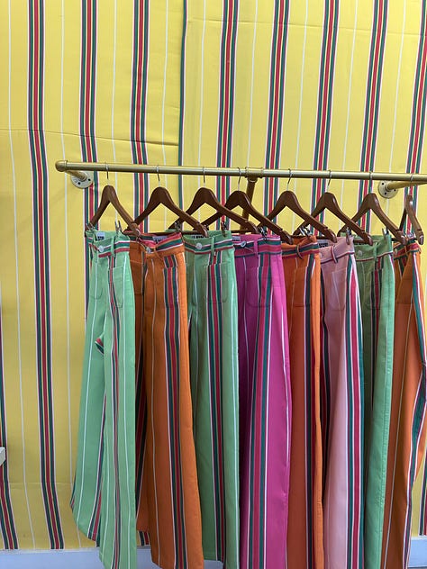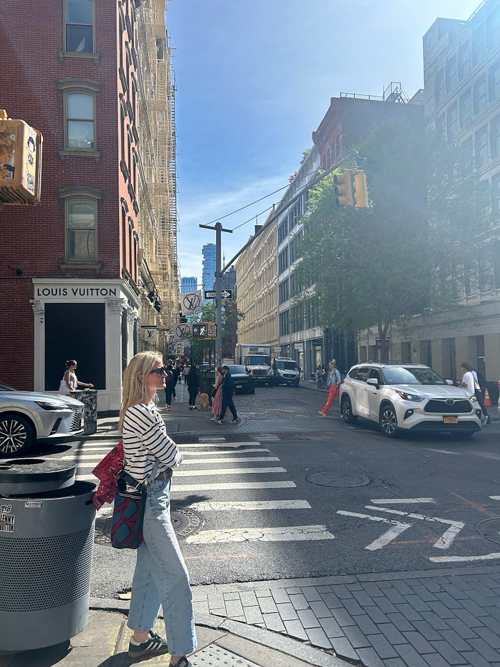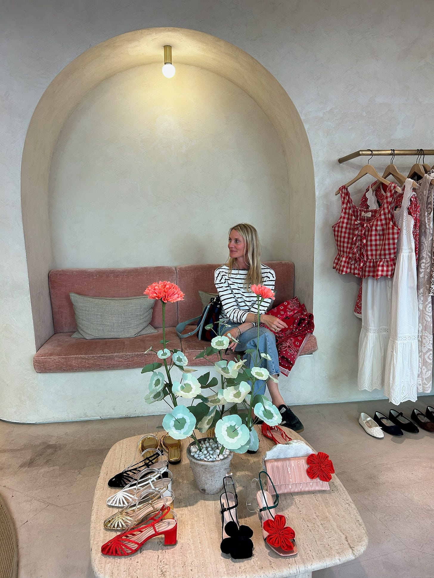 After a 5.30am start at the Flower Markets and finishing at 3pm we marched off downtown and pounded the sartorial pavements. What a joy to find so many gorgeous well known shops and some newer additions. Of course, we had to stop in at Loeffler Randall (the store is beyond pretty with such a happy vibe), tracked down the La Veste pop-up and bought these stripy jeans that I have been obsessing over, found Farm Rio (and spotted an Adidas collab! and the prettiest summer dress), discovered excellent belts, denim and the super fun bird earrings at Madewell, plus too many more to count. The step count was over achieved that day! Uptown we found the chicest knits at La Ligne, window shopped at Celine and Hermes (the windows!), dropped into Jones Road for some Miracle Glow and other delights… and obsessed over the plum-coloured-ruched-suede boots at Isabel Marant that have been on my mind for months….