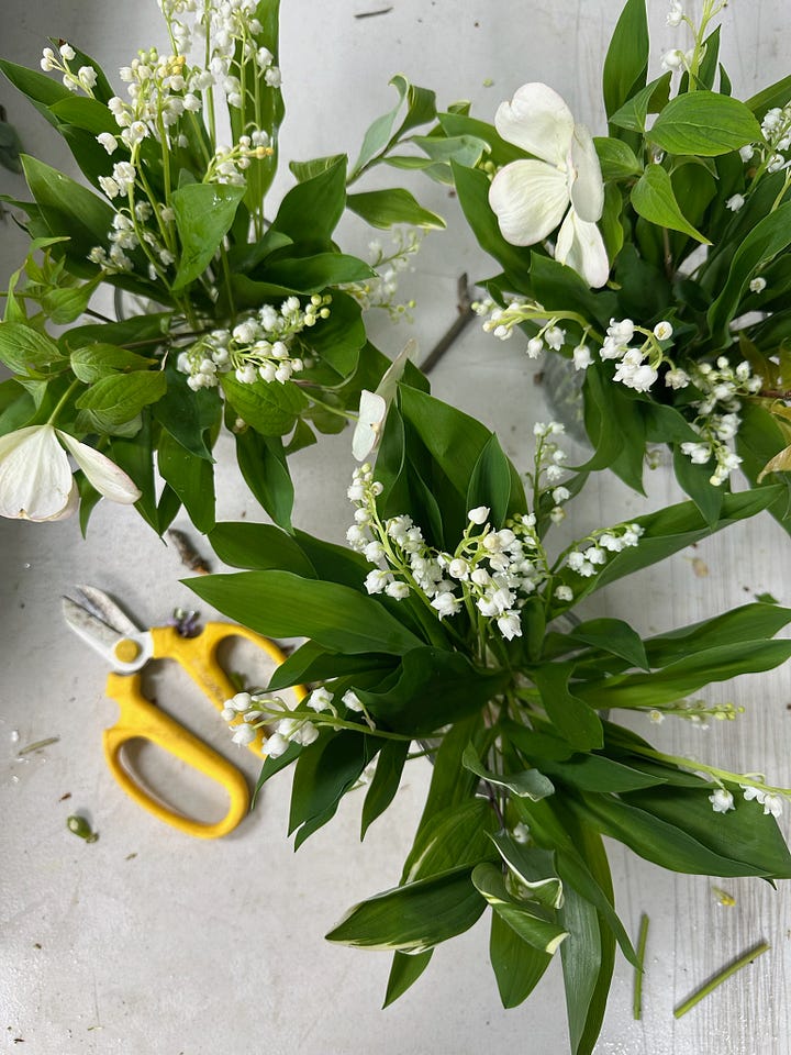 I wanted a palette of soft, seasonal, springy, locally grown, airy flowers - a layering of palest pink blossom branches, enormous peonies - just in their first week of harvest - in pinks with a dark red to punctuate the saccharine; sweet pea in cream and in lilac, giant pale pink and red striped tulips, creamy ranunculus, ammi, frothy lilacs, Solomon seal and vibrant viburnum. The Lily of the valley was very good, in wonderful condition and also so apt on the 1st of May. At one point I considered a whole sea of just lily of the valley but no, we needed colour and form and dancing soft florals to catch the candlelight on such a special occasion.