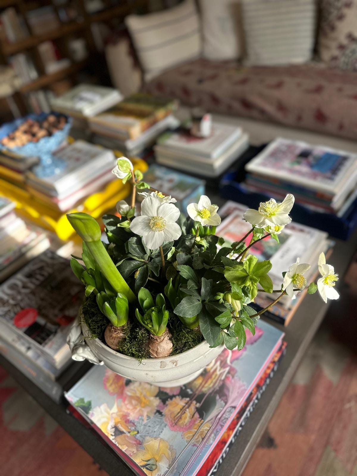 When it’s all a bit bare out there in the garden and the garden centres are turned into Christmas tree outlets, oh the joy of finding a sea of hellebores this week! I’ve potted them up here with some white hyacinths and a white amaryllis with the bulbs topped off with moss, and added a little bit of drainage with some gravel at the bottom of the pot…