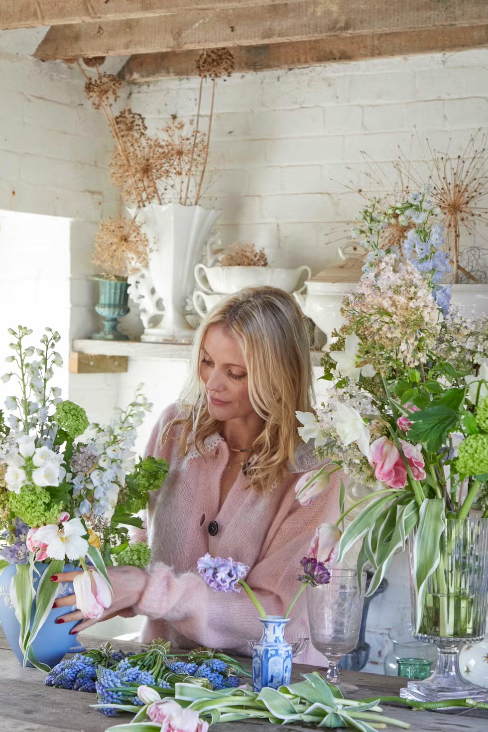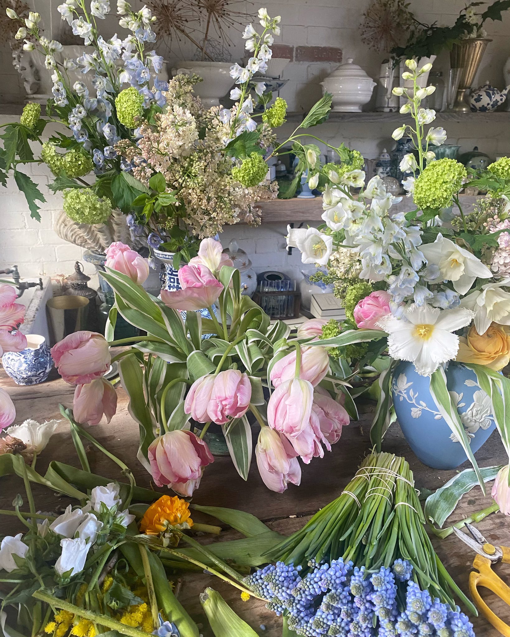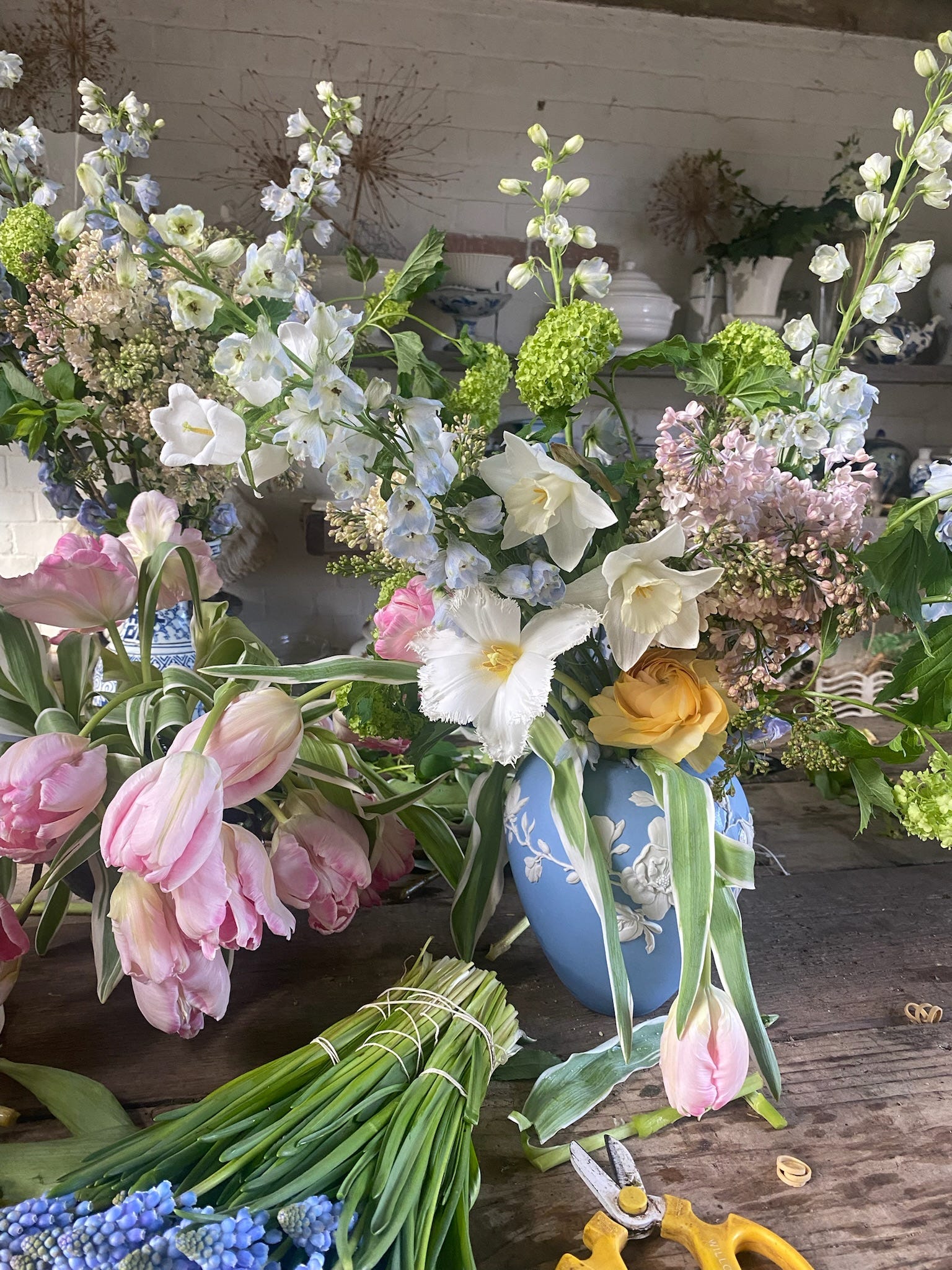 I just found images of a spring shoot I did for Harpers Bazaar a couple of years ago - photographed at home and in my studio. I love the soft, romantic palette of pastel spring flowers in vintage Wedgwood, cut glass and blue & white vases. This is my ultimate bouquet of love - romantic, soft, airy, feminine colours and shapes and not a red rose in sight! Pillows of soft-hued dusty pink tulips dance with muscari, narcissi, soft white daffodils, delphiniums, and campanula. The jolt of vibrant green from guelder rose and a tiny touch of peach ranunculus balances any hint of saccharine. It’s a little early for many of these Spring flowers but this is a palette I return to again and again.