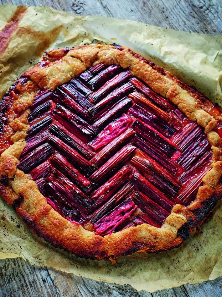 Preheat the oven to 220°C/Fan 200°C/Gas 6. Toss the rhubarb in a bowl with the orange zest, sugar, salt, juice and wine and mix well. Arrange the rhubarb on top of the pastry and sprinkle over any remaining sugary mixture.