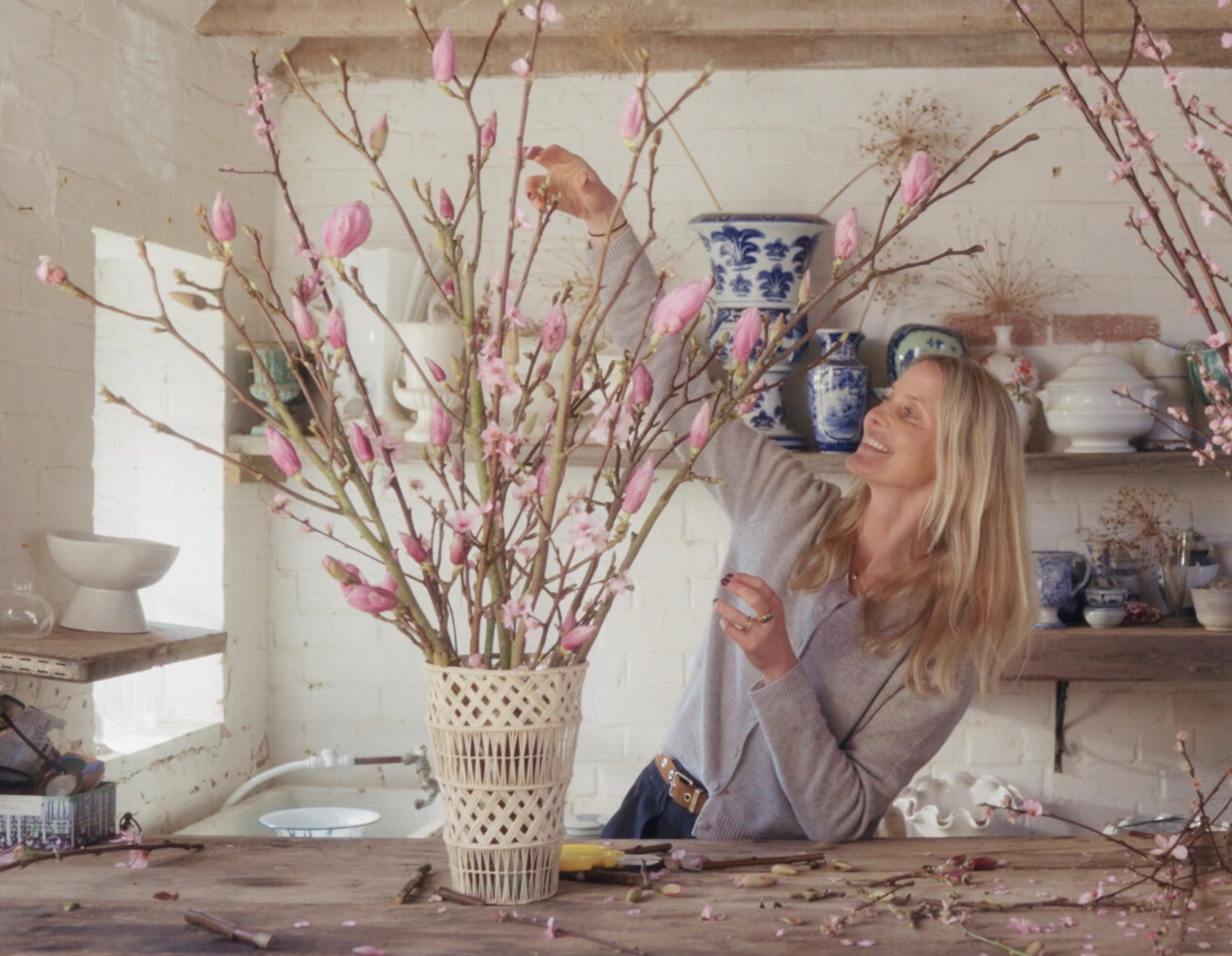 Creating a large scale arrangement with seasonal magnolia and blossom in our (coming soon!) raffia vase for summer. This room in my home in the countryside has the height and light to take a large arrangement and it really does celebrate all that is joyful about spring. This is not a difficult arrangement, of course, but in this video, I encourage you to think about scale and restraint (when to stop adding branches is key for me) and also how to ensure your stems are conditioned to take in as much water as they can while inside to make the vase life as long as possible…
