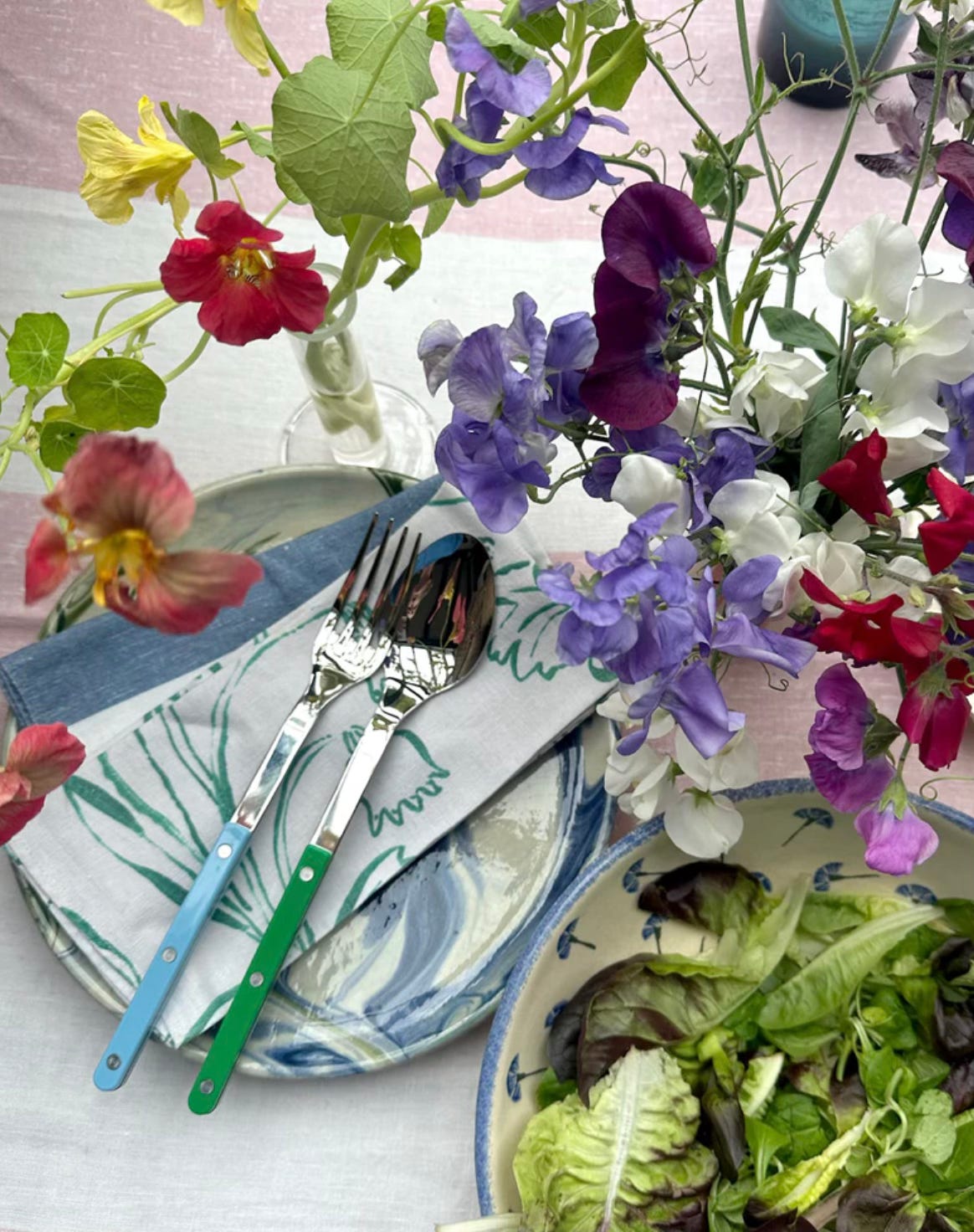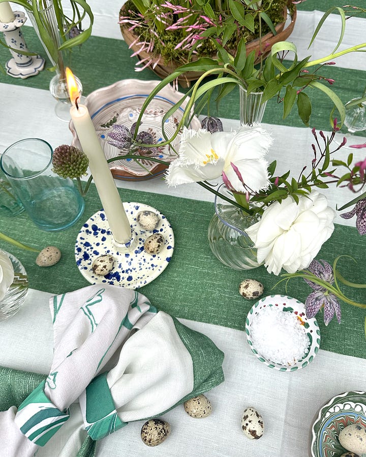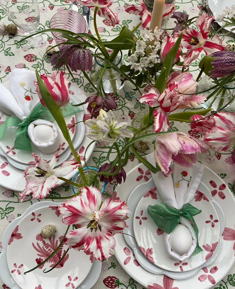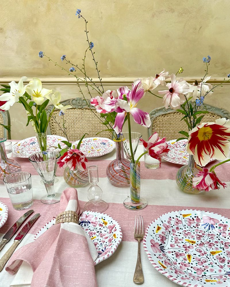 I always start with a cloth to set the scene. While it’s not always practical to use linens every day, an occasion like Easter or eating outside for the first time, or a seasonal Sunday lunch definitely calls for table linens. It’s a little like ‘If in doubt wash your hair’ - Anya Hindmarch’s wise words. Well I say, if in doubt, add the tablecloth, you won’t ever regret it! Your guests will feel like it’s a special gathering and the good vibes will flow from there…It also helps set the colour palette and I either choose the linen first and the flowers in a complementary hue or vice versa.