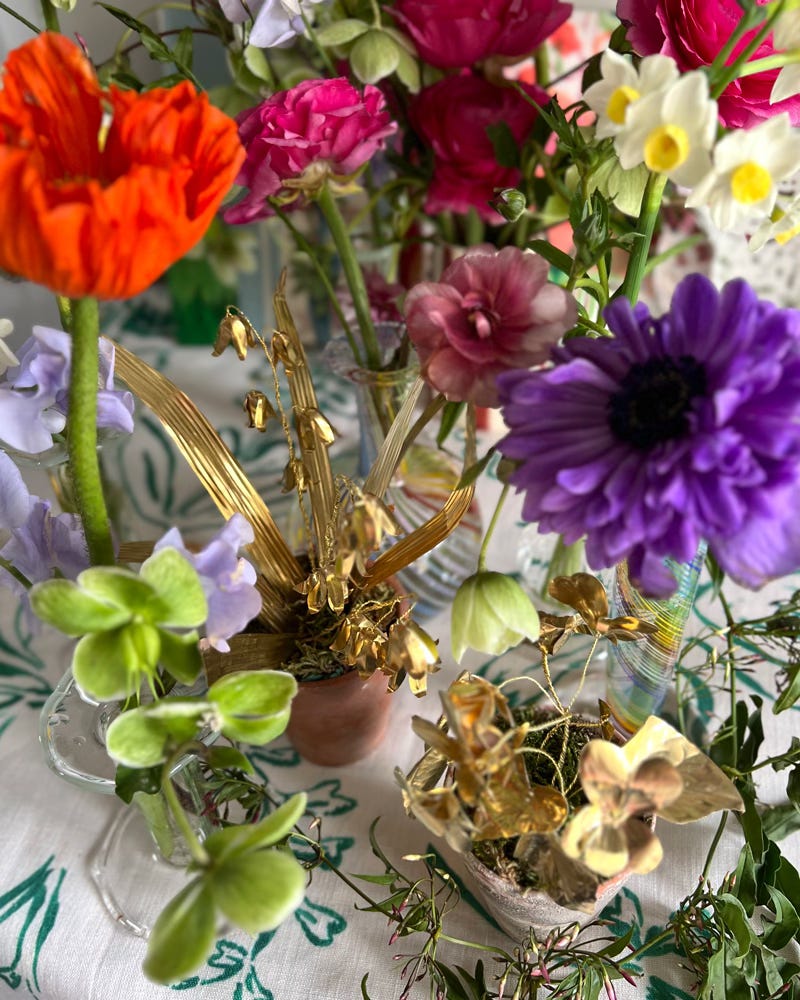 I also love to mix flowers in bloom with crepe paper flowers (our softest lilac anemones are perfect for some pale pastel relief from a riot of seasonal colour) and my absolute favourite this Easter are the brass bluebells in a terracotta pot! I’ll have them at each end of the table with cut flowers layered in between….