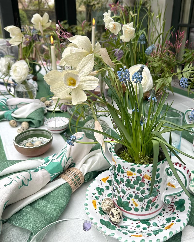 Easter is such an exciting time flower-wise, it feels like the first proper time in the year when we can source really beautiful locally grown flowers, so I can't help going slightly over the top with my Easter table. I love mixing potted bulbs and cut flowers together, introducing as much colour and pattern as possible. I also like to keep an undulating line down a long table so varying the heights of flowers and vases as it looks interesting, layered and abundant, but also helps guests see each other across the table and allows for shared plates in the centre…