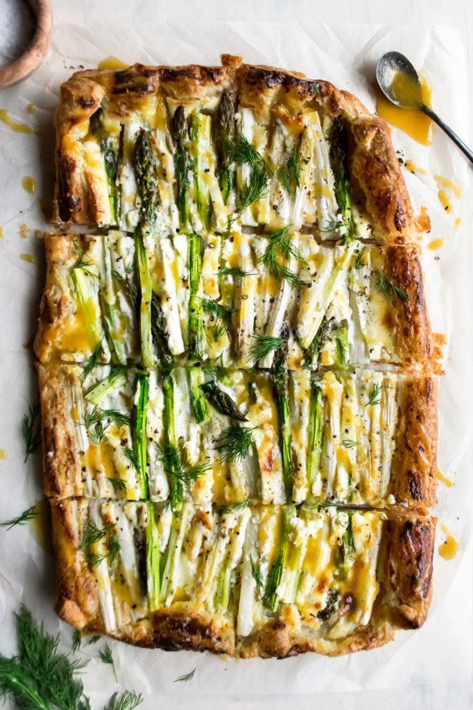 Buttery, flaky, slightly creamy, and very seasonal… using store-bought puff pastry to keep this nice and easy. The tart is filled with a layer of creamy mascarpone cheese and fresh asparagus. Baked until golden and drizzled with a sweet honey mustard sauce. This is the perfect spring appetiser or easy throw-together weekend lunch…