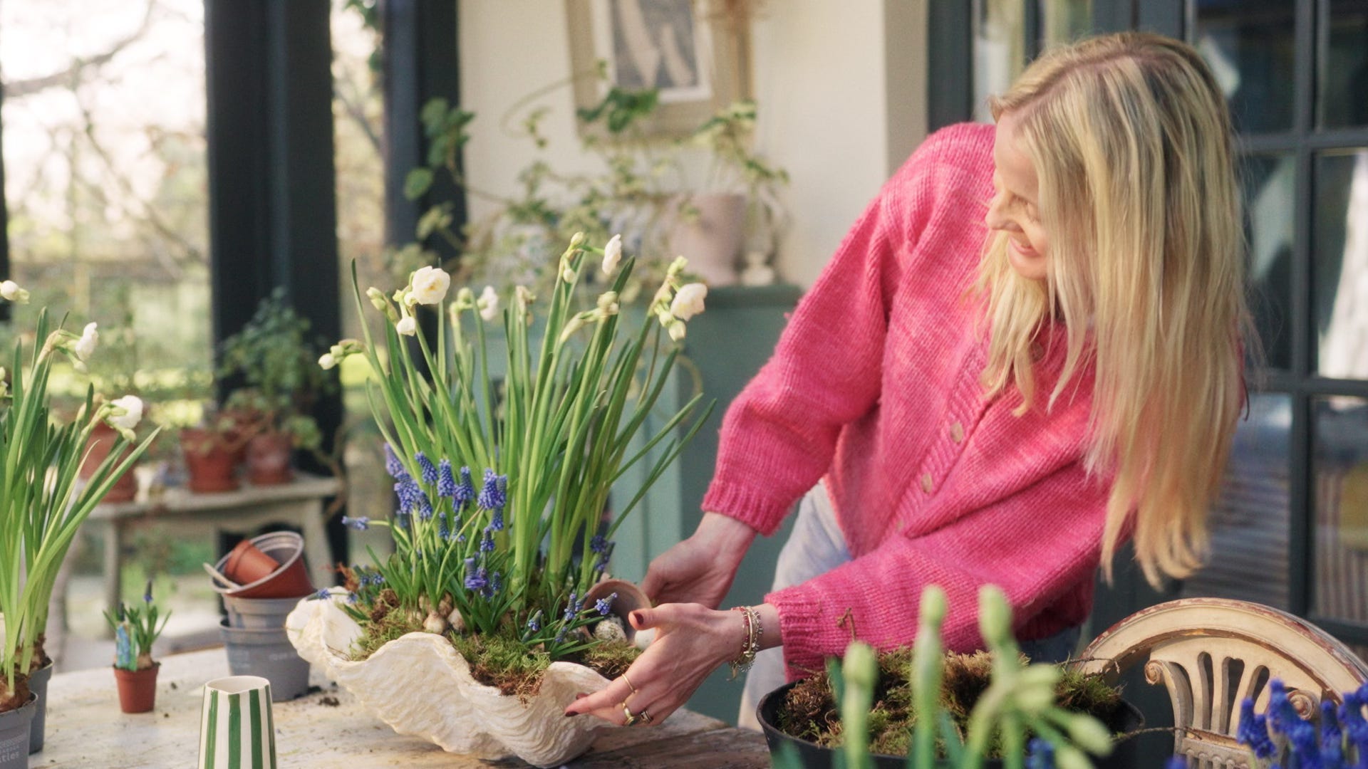 It couldn’t be easier to create this beautiful spring table centrepiece. You can fill with whatever bulbs you have to hand (I’ve used paperwhites and muscari), and add some speckled eggs for a nod to Easter….