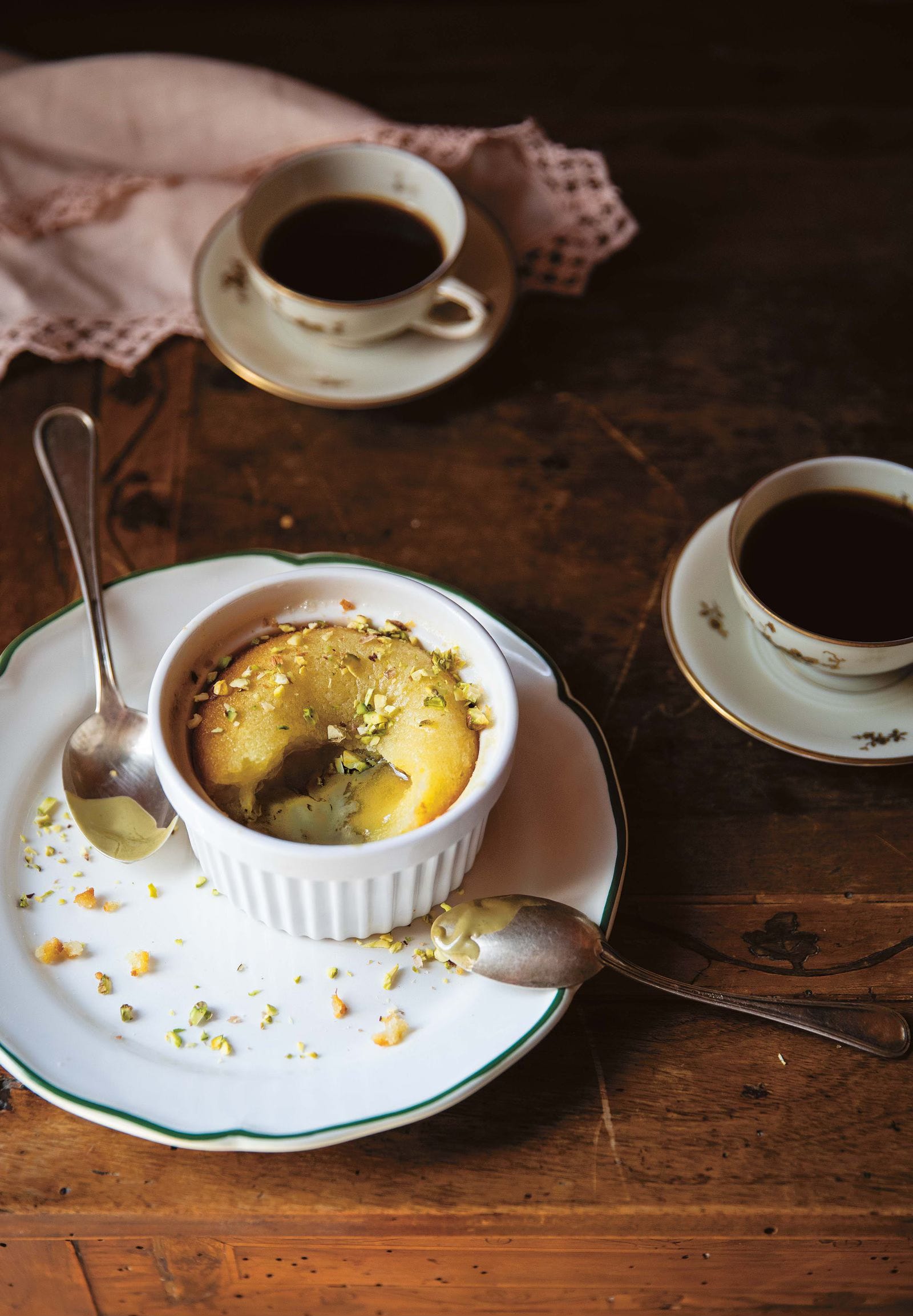 A wonderfully fudgy dessert somehow in the same family as sticky toffee pudding. The tortino or ‘little cake’ is made from white chocolate, which gives it that intensely dense texture, then baked at its centre is a dollop of melting sweet pistachio cream. This you can buy in jars – most Italian delicatessens or specialist online suppliers stock it – or make for yourself following my recipe (see page 215). I love white chocolate and pistachio together, but you could equally substitute a dollop of chocolate-hazelnut spread for the pistachio cream. Once prepared, these need to rest in the freezer for a few hours, so you do need to think ahead; but on the flip side you can make them in advance and have them ready to pop in the oven when needed.